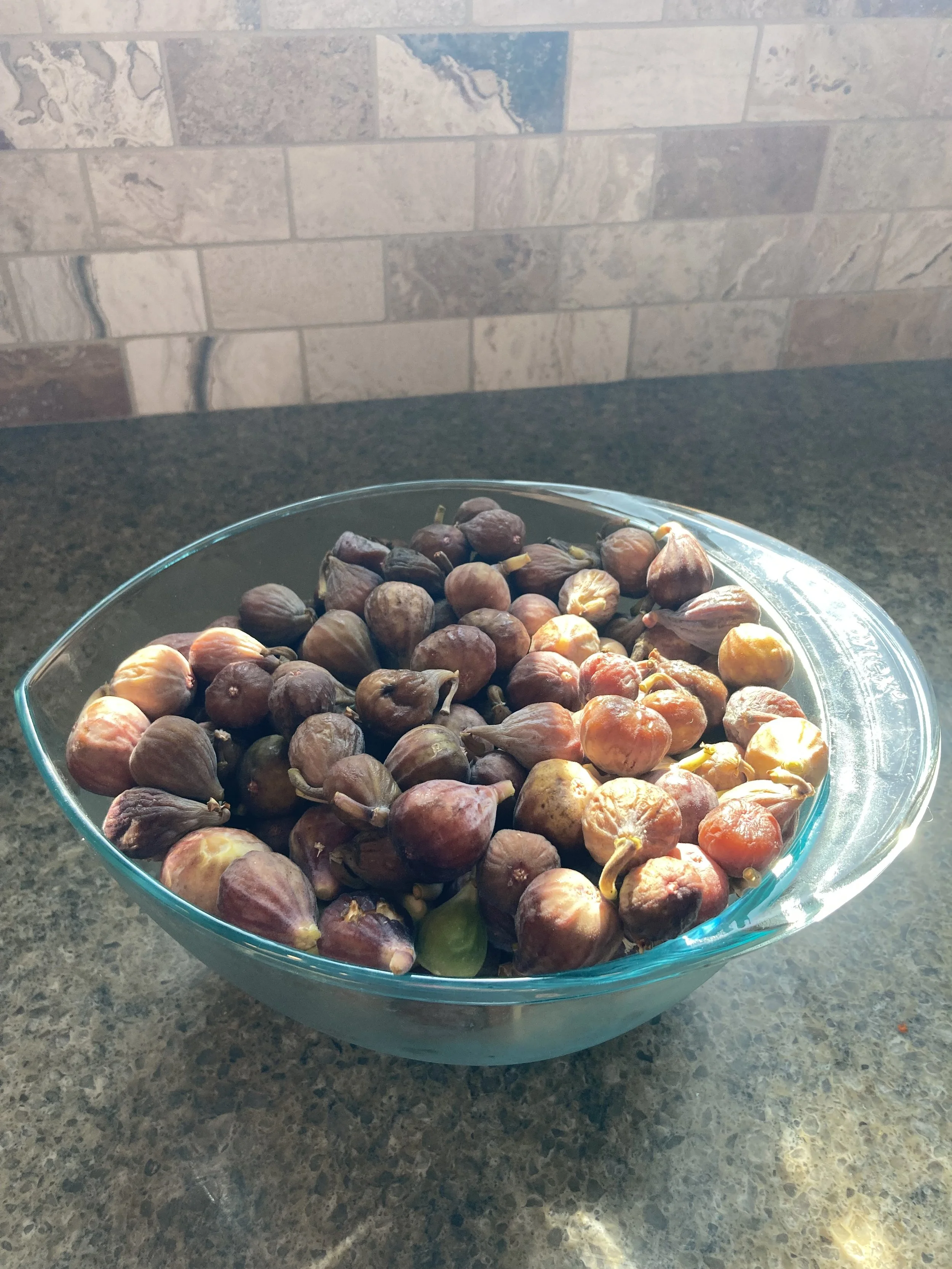 10 cups of tiny, homegrown figs in a clear bowl on granite with marble behind them. Author’s image.